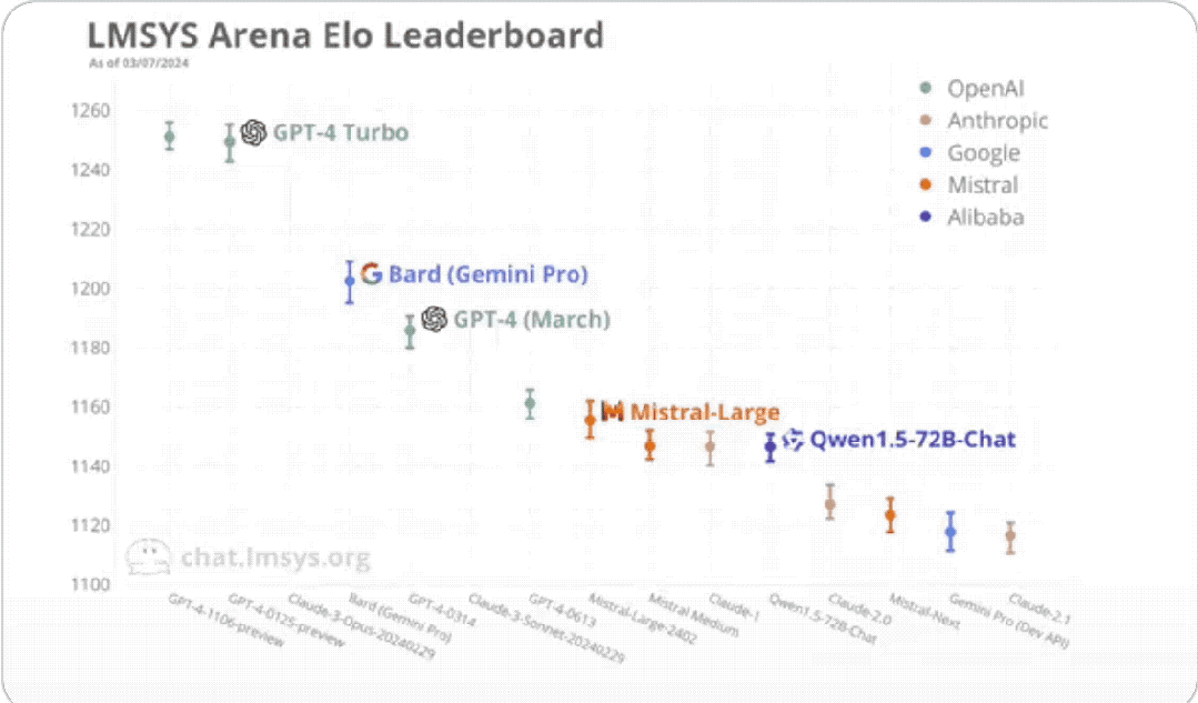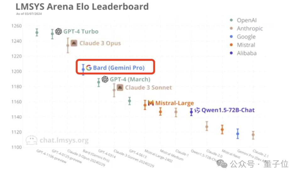 首先要提的就是基于Gemini Pro的Bard,排名第四,仅次于GPT-4Turbo和Claude 3。