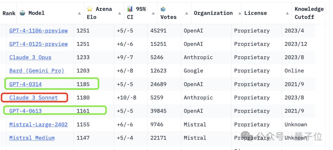 至于中等性能的Claude 3 Sonnet,则排名第6,位于GPT-4这两个版本之间: